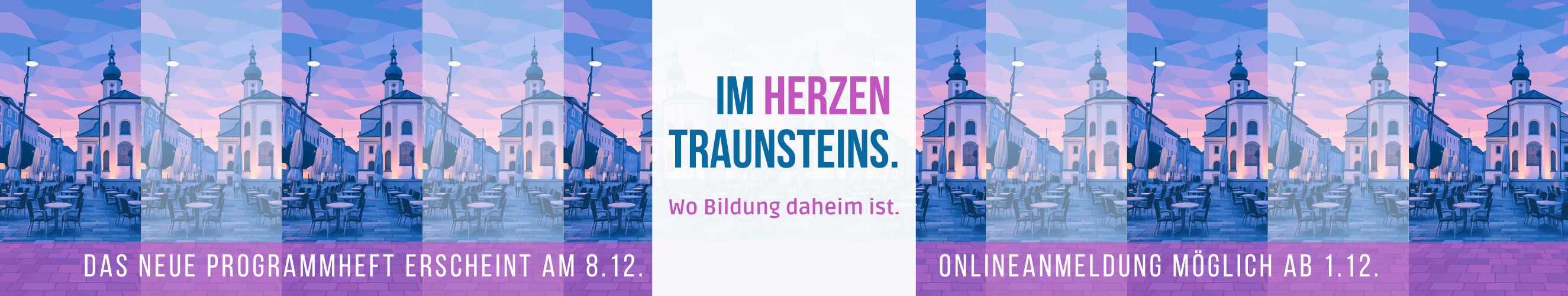 Auf diesen Seiten finden Sie alle Informationen zum Weiterbildungsangebot der Volkshochschule Traunstein e. V. und deren Außenstellen. Pro Jahr nutzen über 8.000 Teilnehmenden aus Stadt und Umland die rund 500 Angebote der Traunsteiner Volkshochschule. Ob Kinder, Jugendliche, Erwachsene oder Senior*innen, Sie alle sind herzlich eingeladen, die vielfältigen Bildungsprogramme zu besuchen und davon zu profitieren.